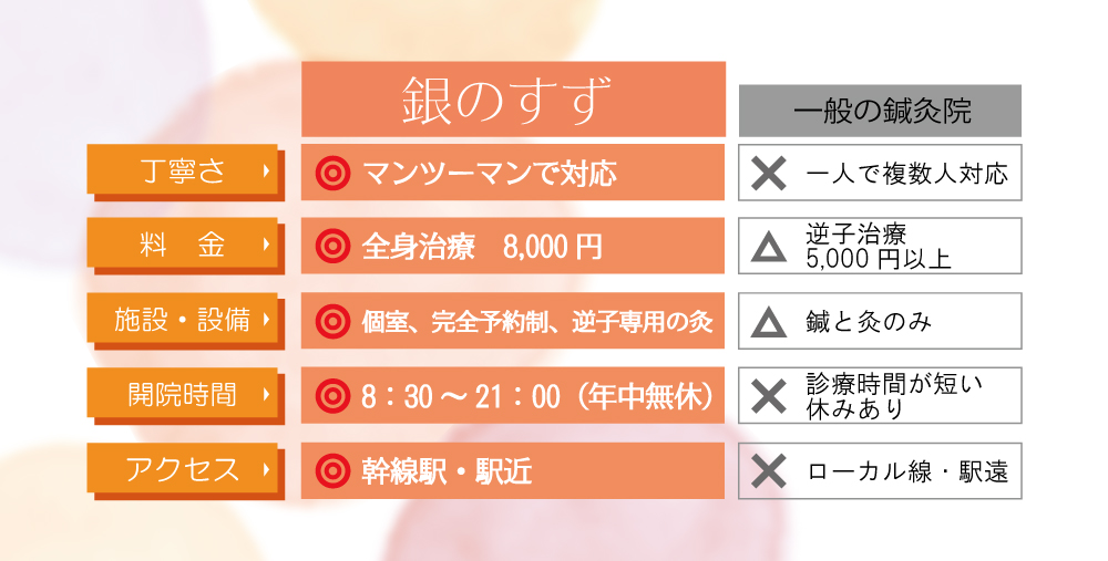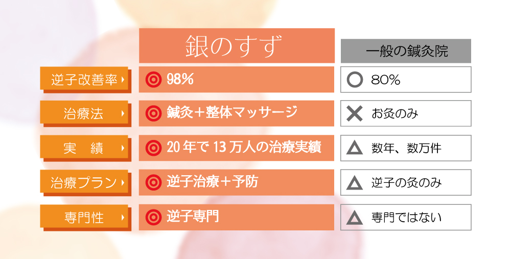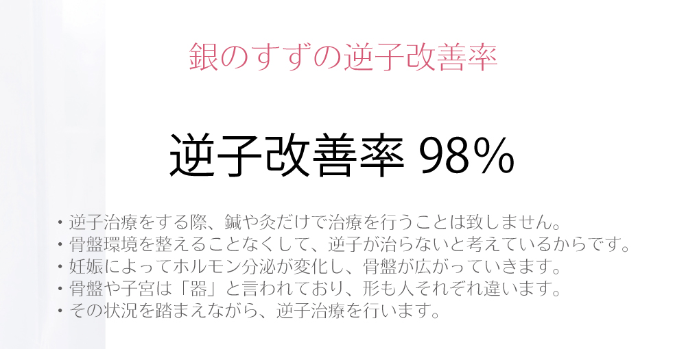 銀のすずでは、赤ちゃんの位置を把握し、オリジナルメソッドで骨盤周辺の状態を整え、赤ちゃんが動きやすい環境を作り、そのうえで逆子の灸を使います。
